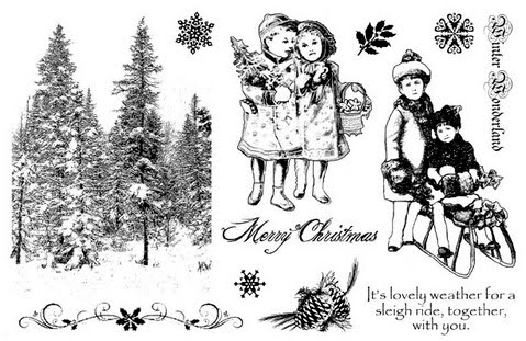 This is the September release called Sleigh Ride from Artistic Outpost. I love that it has the lovely images of children in their holiday finery. I also love that it includes some favorites of mine (snowflakes, trees, pinecones) as well as beautiful sentiments.