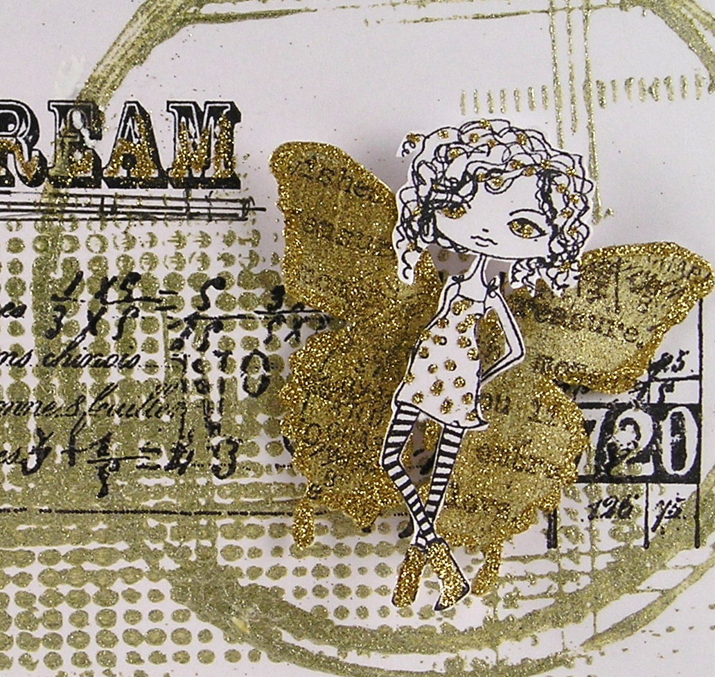 The girl was stamped on white cardstock using black archival ink. I then cut her out using my detail scissors. I added touches of glitter to her using a fine tip glue pen and then sprinkling her with the glitter. The butterfly and the word dream also received a glittery finish.