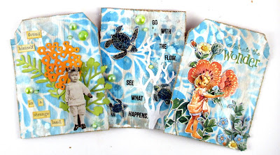 The tag uses a embossing folder, some die cut lace and a lovely sentiment (Verses Rubber Stamps) stamped in blue. The colors of the wedding are a soft salmon and navy blue and I tried to incorporate that in the tag. The flowers ended up a bit brighter than I had anticipated.
